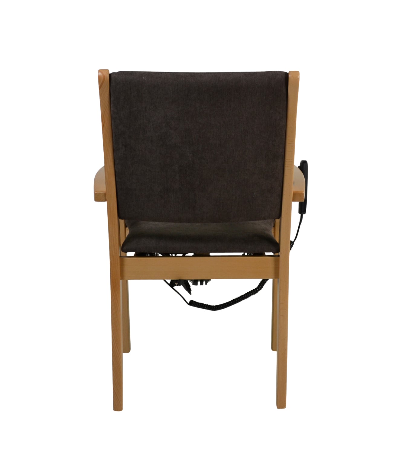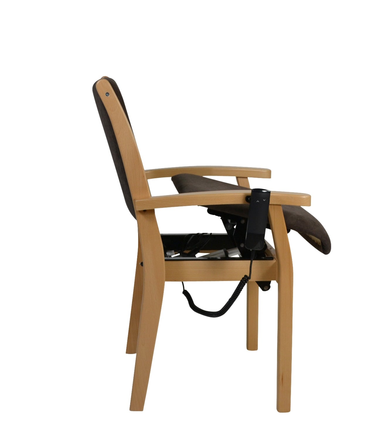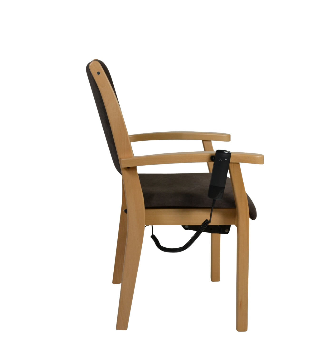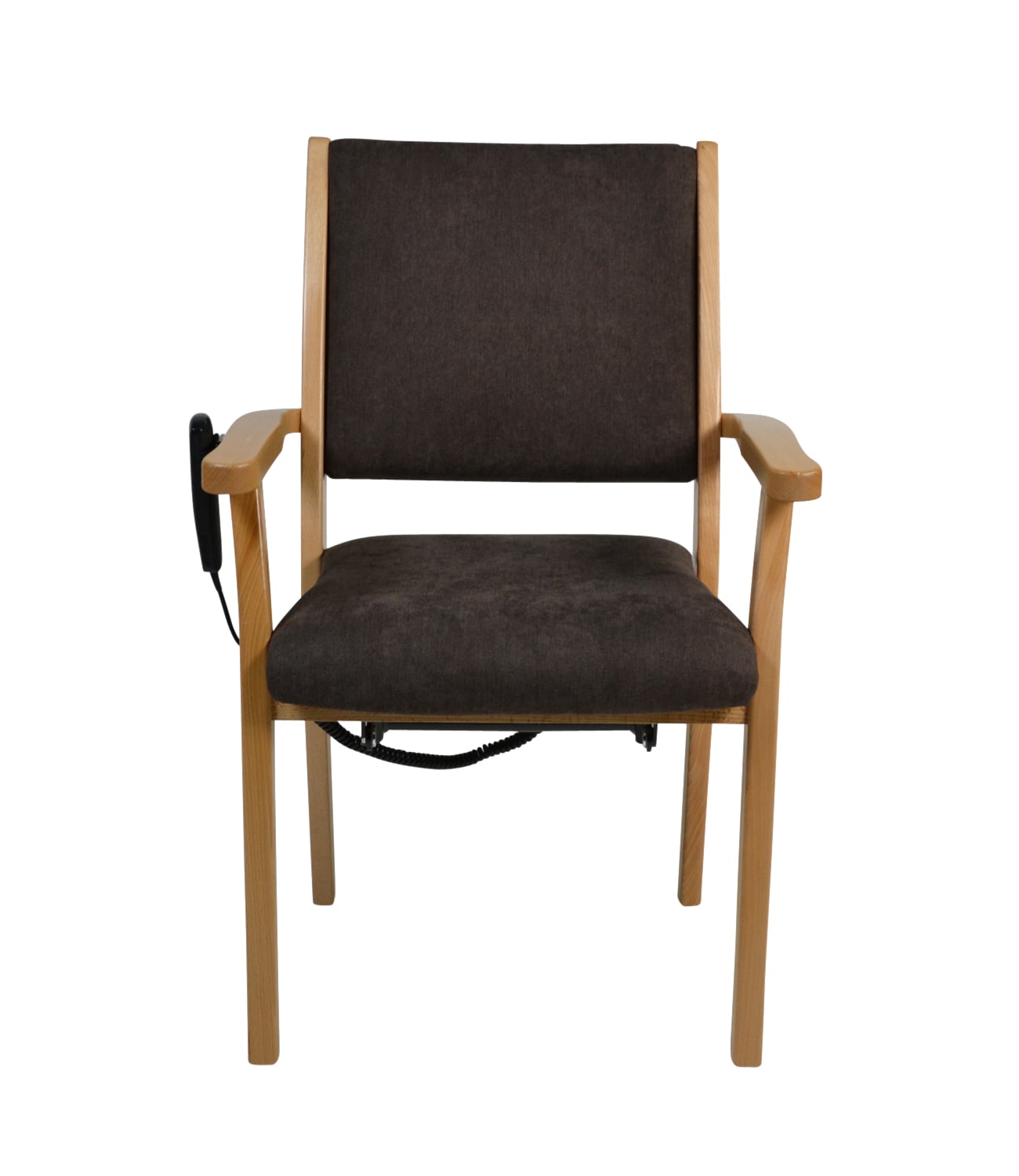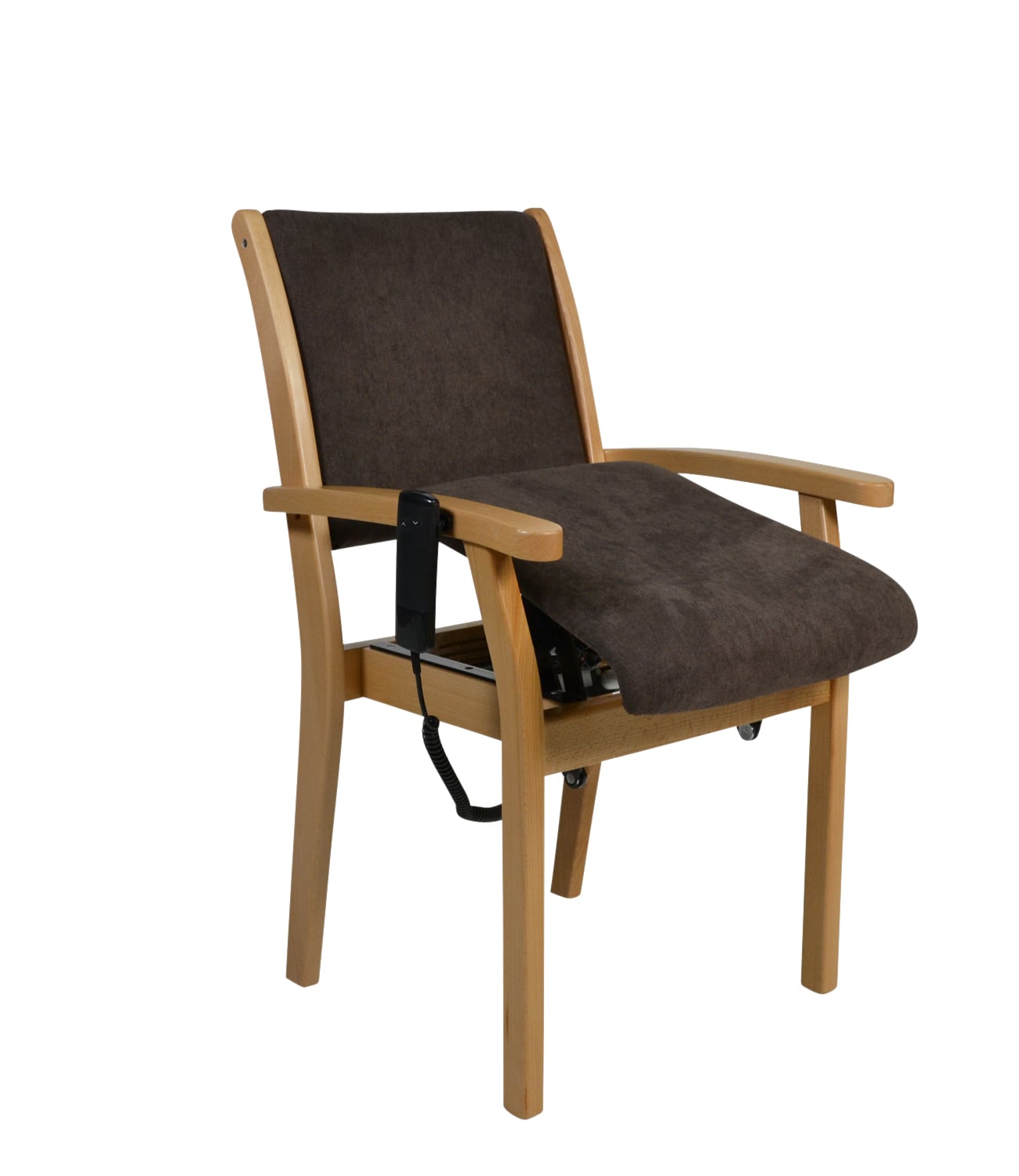 La structure en bois de qualité supérieure en hêtre massif et les accoudoirs légèrement incurvés avec un pommeau arrondi confèrent à la chaise une grande stabilité et un design élégant. L'assise ergonomique et le rembourrage souple du dossier assurent une assise confortable et saine pendant de longues périodes. La chaise est disponible en différentes hauteurs d'assise, qui peuvent être adaptées aux besoins individuels et aux pathologies des utilisateurs. L'aide électrique à la verticalisation complète ce confort en minimisant l'effort nécessaire pour se lever et peut réduire les douleurs.