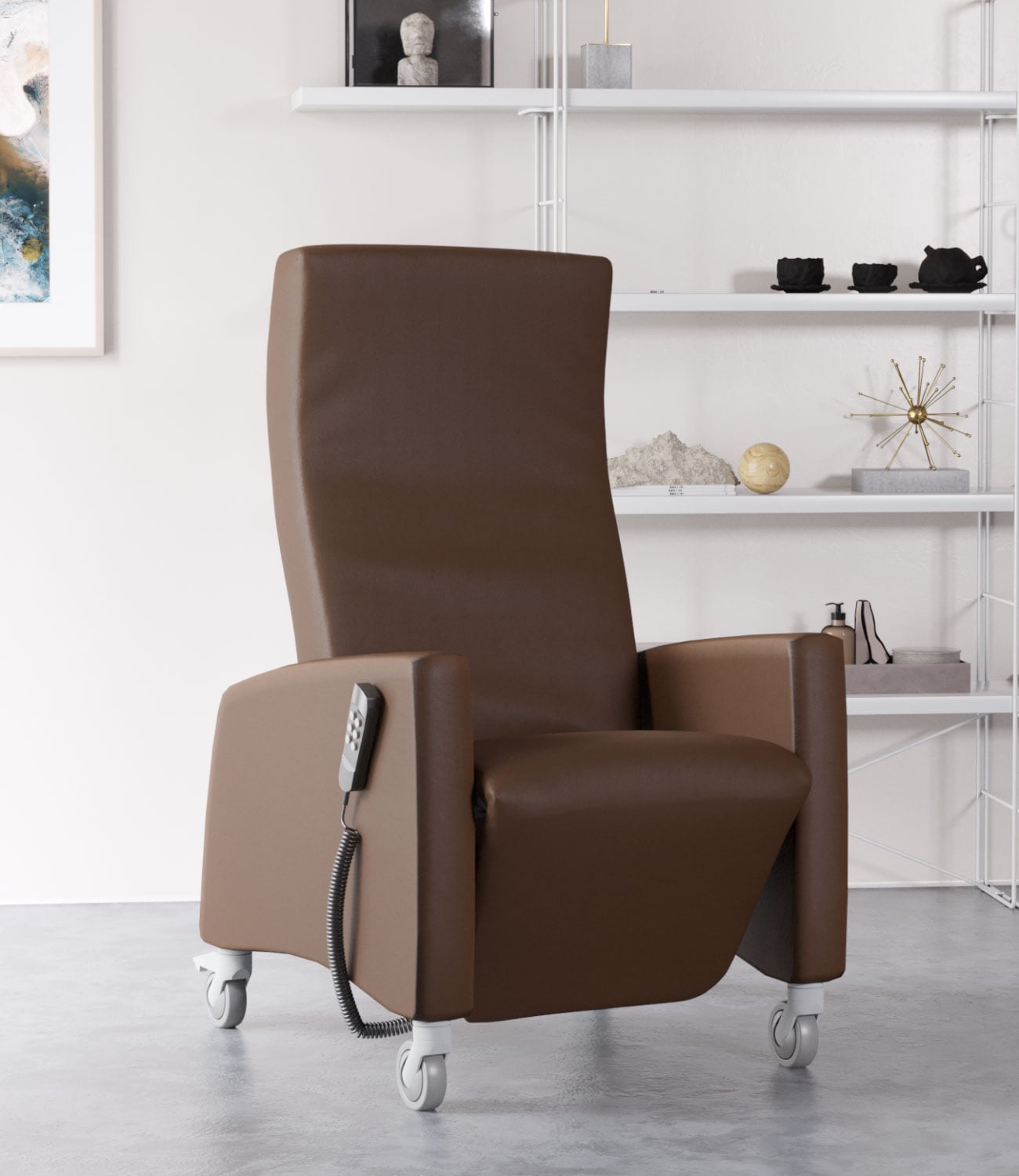 Le fauteuil de soins Lutra Relax convient aussi bien aux soins à domicile qu'aux établissements de soins professionnels. Avec une largeur extérieure d'environ 70 cm, il passe facilement par la largeur de porte standard de 74 cm. Cela permet de changer facilement de position, de sorte que l'utilisateur puisse participer à la vie sociale dans la cuisine, le salon ou à l'extérieur, sans devoir renoncer à sa mobilité. Le fauteuil de santé offre la meilleure ergonomie d'assise et soulage le dos et les articulations. Le dossier peut être réglé séparément en continu et les positions d'assise peuvent être réglées manuellement ou à l'aide d'une commande manuelle à deux moteurs. L'utilisateur peut ainsi choisir, selon ses besoins, entre la position assise droite, la position de relaxation et la position allongée. De nombreux accessoires tels que le siège chauffant, la tablette amovible ou le coussin de nuque complètent l'offre. De grandes roulettes stables et la poignée de poussée assurent la mobilité du fauteuil de soins Lutra Relax. Les roulettes en plastique de haute qualité sont faciles à pousser et conviennent également pour les parquets de qualité. Le fauteuil de repos et de soins Lutra Relax est conçu pour un poids maximal de 120 kg.